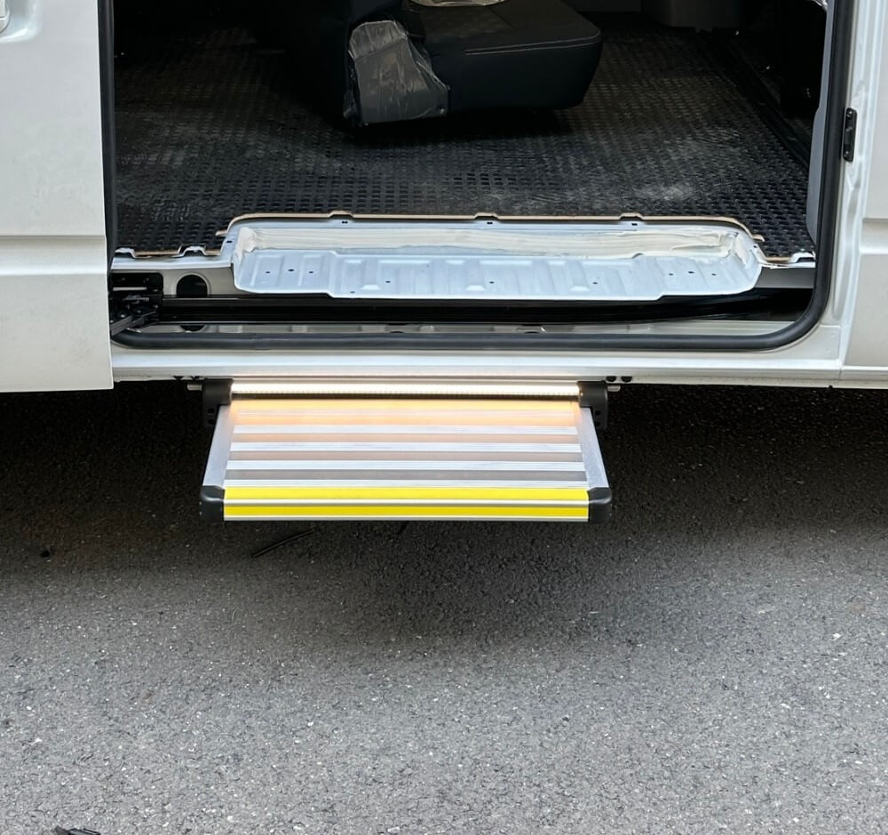 With an IP67-rated motor and wiring protection, the step performs reliably in rain, dust, and harsh outdoor environments. Its anti-slip surface ensures secure entry and exit, even in wet conditions. Simple installation and seamless integration make it an ideal upgrade for transport vans, wheelchair-accessible vehicles, and service fleets.